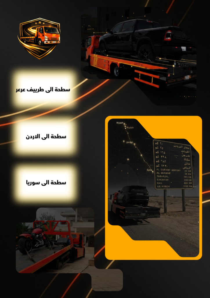 سطحة أبو مشعل تقدم لك خدمة احترافية في نقل السيارات من الرياض إلى طريف وعرعر، وكذلك النقل الدولي إلى الأردن وسوريا، مع التزام كامل بالمواعيد وأعلى معايير الأمان.